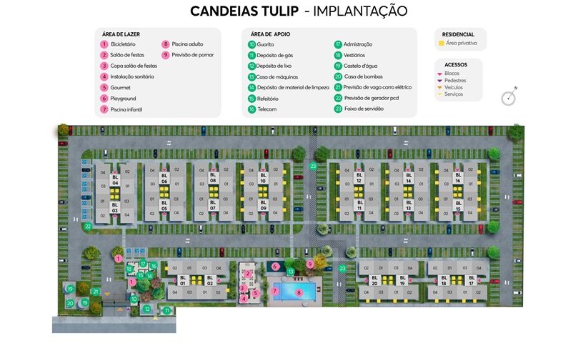 Apartamentos em um lindo condomínio fechado, com toda segurança e comodidade que você e sua família merecem. Sabe por quê? Porque aqui oferecemos o que há de melhor em infra estrutura, como: apartamentos de 2 quartos, ampla área de lazer com churrasqueira, playground para a criançada, piscinas adulto e infantil, espaço gourmet e um lindo espaço verde interno para um pomar.