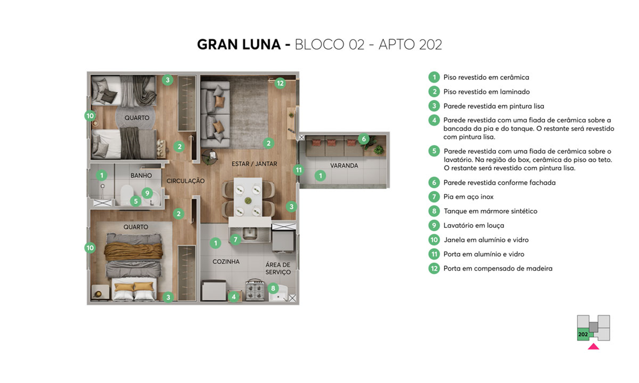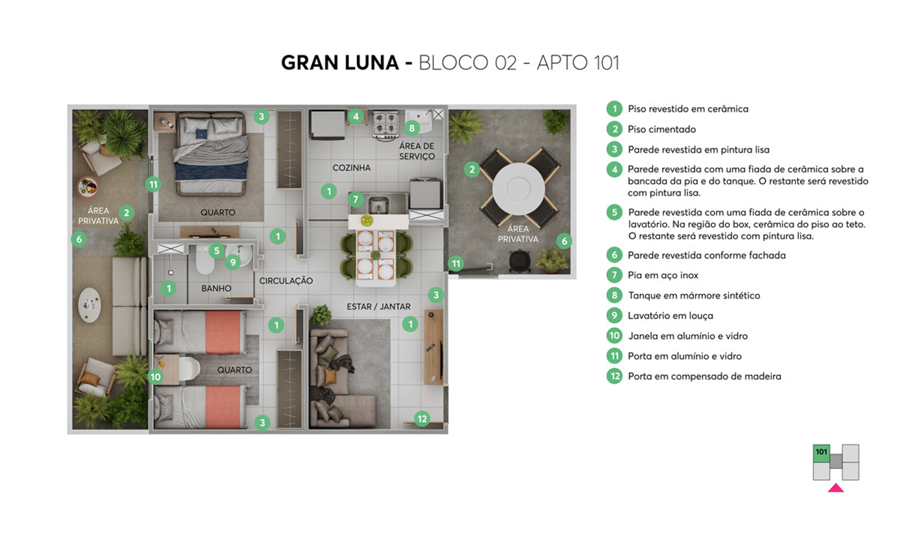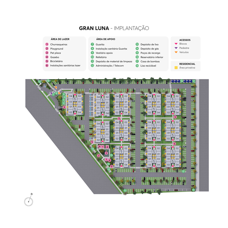 O Gran Luna é um condomínio residencial que oferece apartamentosde 2 quartos com opções de varanda combinada a uma área de lazer completíssimo: têm playground para criançada se divertir, área com churrasqueira para uma resenha com os amigos, pet place para o seu animal de estimação aproveitar o ar livre, espaço com bicicletário descoberto para você guardar sua bike e lindo gazebo para dar aquela relaxada em contato com a natureza.