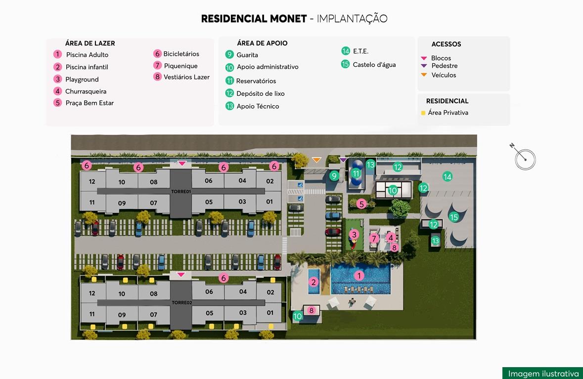 Comece hoje mesmo uma nova fase de em sua vida com autonomia e segurança no Residencial Monet. Um condomínio residencial que oferece mais que um lar, mas também a liberdade do aluguel para algo só seu. São apartamentos de 2 quartos com opções de varanda ou área privativa e torres com 3 elevadores. Tudo pensando para oferecer mais conforto no seu dia a dia.